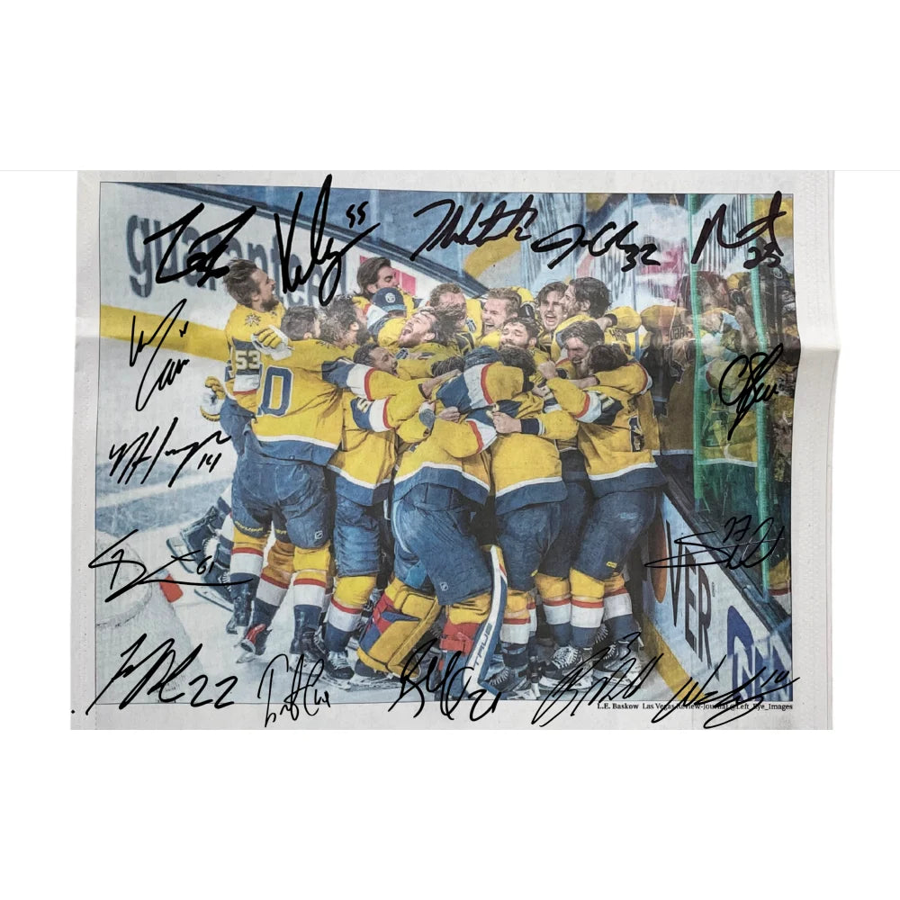 Vegas Golden Knights Fans! This item is your calling, featuring an autographed Las Vegas Review-Journal (LVRJ) signed by 15 players from your 2023 Stanley Cup Champions! Names include: Mark Stone, Jonathan Quick, Shea Theodore, Alec Martinez, Logan Thompson, Nicolas Roy, Keegan Kolesar, Nic Hague, Chandler Stephenson, Ivan Barbashev, Brayden McNabb, William Carrier, Brett Howden, Zach Whitecloud & Michael Amadio. This is an original newspaper, not a reprint, copy or reproduction released the day after they won on June 14, 2023. It is the front page and the entire first section of the newspaper and from that day and that is uncirculated fromthat day, so it's in new condition. This is a big time item to own, and you will find this team signed item nowhere else but Inscriptagraphs! A few signatures alone on this newspaper are difficult VGK signatures to find on any team signed items including Jonathan Quick, Michael Amadio & Nic Hague which makes this item stand out!