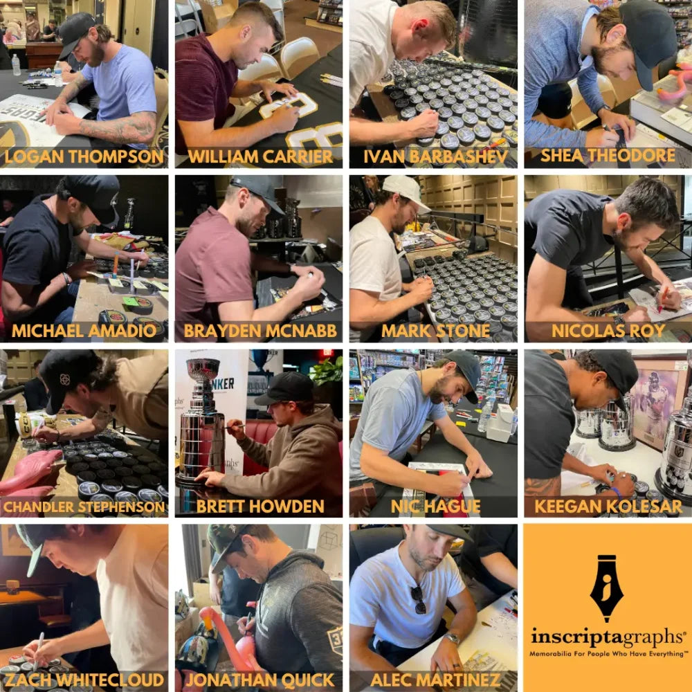 This item is certified authentic by Inscriptagraphs Memorabilia and was signed at multiple signings with each player in 2023 in Las Vegas, NV. We are a brand name in the business for Golden Knights player signatures, as we are the leader in this space for unique signed autographs. The certificate is available on the Inscriptagraphs Memorabilia hologram database website that is indicated on the gold tamper-proof hologram on the item. This item will also include the paper certificate of authenticity card. You will enter the code number on the hologram of this item into our database and up will pop the certificate of authenticity for this item, forever. You can print out that document as proof of the authenticity of this collectible.