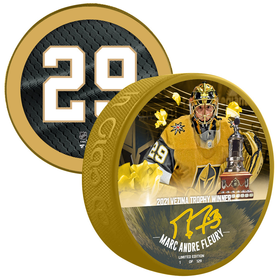 Take your collection of Vegas Golden Knights memorabilia to the next level with this autographed Marc-Andre Fleury Hockey Puck with "2021 VEZINA" Inscription. Whether displayed in your home or office, it's the perfect way to highlight your passion for the Vegas Golden Knights for years to come.